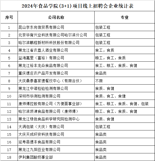为全力推进学院2025届毕业生就业工作,提高毕业生毕业去向落实率,按照《食品学院、北大荒农产品加工现代产业学院卓越人才(3+1)项目》相关要求,食品学院于9月3日邀请伊利集团酸奶事业部、益海嘉里(富裕)有限公司、华测检测认证集团股份有限公司、杭州康师傅方便面有限责任公司等18家企业开展了线上招聘会。