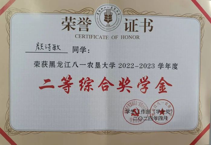 颜诗敏,女,共青团员,黑龙江八一农垦大学食品学院2022级食品科学与工程专业学生。现任班级班长和寝室长,曾荣获国家奖学金、国家励志奖学金、王震奖励基金尚学奖、二等综合奖学金等,曾荣获校三好学生、优秀共青团员、院优秀志愿者等荣誉称号,曾获省级第一届“东方杯”食品创新创意大赛三等奖、黑龙江省新文科实践创新大赛校赛二等奖和三等奖。