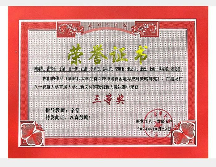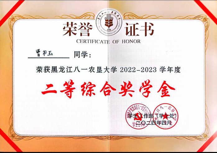 曹书玉,女,中共预备党员,黑龙江八一农垦大学食品学院2022级食品营养与健康专业学生。现任班级学习委员和北大荒科技社团文化部部长,曾获国家奖学金、国家励志奖学金、一等综合奖学金等,曾获校三好学生荣誉称号,获新文科实践创新大赛三等奖。