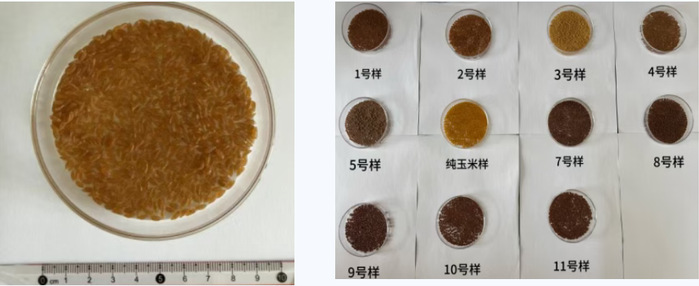 本品是以碎米、大豆蛋白、杂粮粉为主要原料,创新多区段差异化挤压重组技术开发的高蛋白、易吸收重组米产品。通过科学的混料设计,优化了大豆蛋白和三种不同杂粮的复配比例,显著提升了产品的蛋白质含量和营养均衡性。产品复水性良好,蒸煮后米粒完整,口感接近天然大米。且该重组米具有较高的淀粉水解率,便于人体消化吸收。同时,产品研发深度融合了大豆基功能活性成分,其富含的大豆异黄酮代谢物被证实具有调节糖脂代谢、抗氧化、抗炎的潜在健康功效。本产品还为碎米高值化利用提供了新路径,项目与安徽省太和县签约完成,是其2024年的“现代化产业园区建设”储备技术之一,作为创制兼具营养、便利与健康功能的主食新赛道,同时也进一步助力了“豆基杂粮”产业规模化发展。该项技术有效推动了多行业的产业融合,增效提质,一举多得。