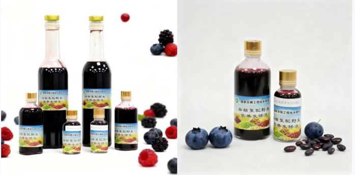本品是以黑芸豆、藜麦等有机杂粮及大豆副产物为基材,复配蓝靛果、沙棘、蓝莓等东北地方特色浆果,采用实验室自行筛选的复合菌系生物发酵加工技术研发的新型健康发酵液产品。该产品通过优化原料组合与发酵工艺,在保留杂粮和浆果原有营养成分的基础上,显著提升了调节糖脂功能活性成分含量,具备维护肠道菌群平衡、抑制致病菌生长、降脂降糖及提高免疫力等多重健康功效,尤其为乳糖不耐症人群摄入益生菌提供了新思路。其采用酵母菌与乳酸菌协同发酵的复合菌系,结合先进技术保障发酵液的稳定性和风味多样性。杂粮发酵优势显著,工艺优化后的复合发酵液功能性成分富集,总酚、总黄酮和花色苷含量分别提高了171.51 mg/g、62.22 mg/g和16.67 mg/g。通过抗氧化性和抑菌性的研究,确定益生菌发酵提高抗氧化活性及体外抑菌活性,SOD酶活力增加了52.96 U/mL。可提升营养功能活性、改善风味口感、提高吸收效率。行业呈现技术驱动、高值化转型特点,正从初级加工向精深加工与产业链整合加速发展。