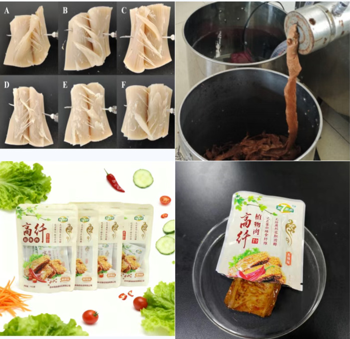 本品是以大豆蛋白、谷朊粉与芸豆粉为基料,通过创新高湿挤压技术开发的新一代植物基杂粮素肉。研究突破性地确立了5:2:3的黄金原料配比及三区精准温控工艺(160℃-200℃-220℃),使产品呈现出酷似动物肉的纤维状结构和自然肉色。质构分析表明,其质地紧密,弹性与咀嚼感俱佳。创新添加0.10% L-半胱氨酸与2%大豆油作为质构改良剂,显著促进了蛋白质分子间二硫键的形成与纤维网络的有序排布,使产品组织化度提升至2.74,咀嚼性高达13324.29 g。该产品可作为优质原料广泛应用于素肉松、素肉排等多种植物基肉制品,为解决传统素肉纤维感弱、质地粗糙的行业难题提供了科技方案,是一款兼具逼真肉感、营养与清洁标签的高品质蛋白基料。其关键技术为植物蛋白开发,膳食纤维含量提35%,营养活性组分>15%,附加值升200%,项目与安徽省太和县签约完成,是其2024年的“现代化产业园区建设”储备技术之一,不仅拓展了杂粮精深加工水平,还高效解决了大豆副产物和药渣增值的行业“卡脖子”难题。