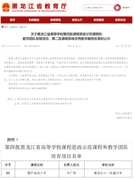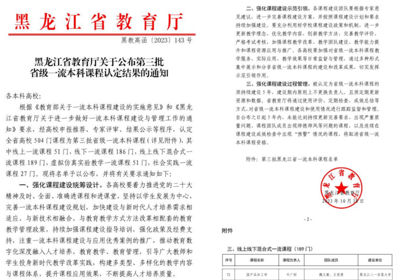 2023年《园产品加工学》课程被遴选为黑龙江省食品科学与工程领域地方高校“101计划”基础学科和“四新”关键领域核心课程的建设课程,发表该课程教改论文2篇。2023年获批第三批省级线上线下混合式一流本科课程(图5),2024年获批第四批黑龙江省高等学校课程思政示范课程(图6)。2024年出版了“十四五”普通高等教育本科部委规划教材《园产品加工学》(图7),在2025年开始进行智慧课程建设,现已经完成了知识图谱、目标图谱、问题图谱和思政图谱的建设(图8)。