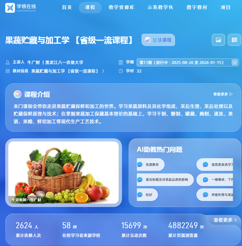2020年完成了《园产品贮藏与加工学》慕课的建设,并于同年完成学银在线上线。线上教学视频完整,课件、章节测验、题库、产品标准等教学资源丰富,并在不断增加。截止目前,该课程在线学习者来自58所院校,线上选课人数已达2624人次,累记网页浏览量已达4882249,累计互动达到15699次。