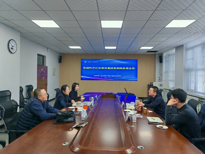 2025年11月17日,牡丹江市农旅投资(集团)有限公司副总经理赵双,黑龙江镜泊湖生物科技有限公司党政办公室主任孙晓东到访食品学院(北大荒农产品加工现代产业学院),与院长张丽媛、专家李兴革围绕黑木耳、鹿茸菇特色菌菇的精深加工展开深入交流,并达成合作意向。