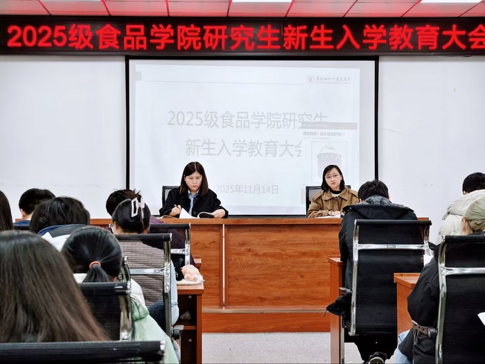 2025年11月14日下午16:00,食品学院(北大荒农产品加工现代产业学院)2025级研究生新生入学教育大会在食品学院3058会议室顺利召开。学院正处级辅导员许春姝、研究生秘书侯美如及2025级全体研究生参会,会议由许春姝老师主持。