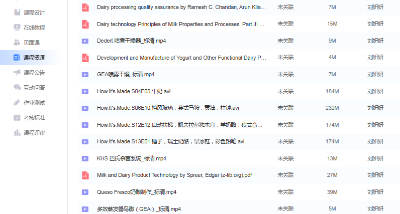 目前线上课程《乳品与健康》共有七章内容。线上资源包括有在线教程视频50个共计564分钟;作业及测试题库;互动问答;设备及工厂视频、动画、幻灯片、电子书、研究论文、学术报告、科普常识、乳业新闻等各类教学资源二百多个。