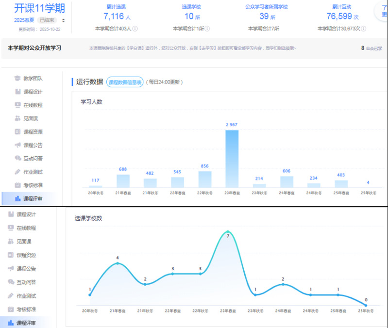 课程目前累计运行11学期,学习人数7116人,选课学校10所,公众学习者所属学校39所,累计互动7,6599次,得到了学生、同行专家的认可和好评。